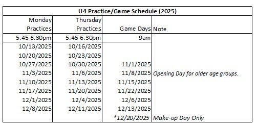 Our U4 Academy is an introduction to soccer designed especially for 3-year-olds. At this age, we don’t form official teams because little ones can be unpredictable. Instead, all players will practice together in one large group. For the 2025 season, we will have 2 options: Mondays and Thursdays at 5:45pm. On game days, we’ll use pinnies to create balanced teams, ensuring equal playing talent and fun for everyone.